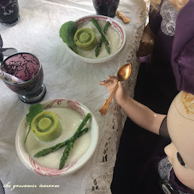 For the next course, an elegant surprise! Jill Colonna, author of the books "Mad About Macarons" and "Teatime in Paris" (and Dear Friend of The Gossamer Tearoom) recently published a recipe on her blog for Asparagus Clafoutis with Parmesan Cream Sauce and so, today, I have recreated it in miniature form for our luncheon. Usually clafoutis are a delicious dessert, made of fruits, baked with a creamy custard. Jill has cleverly created an elegant savory version, which I was happy to bake in my silicone chocolate mold and plate in miniature version for today's luncheon!